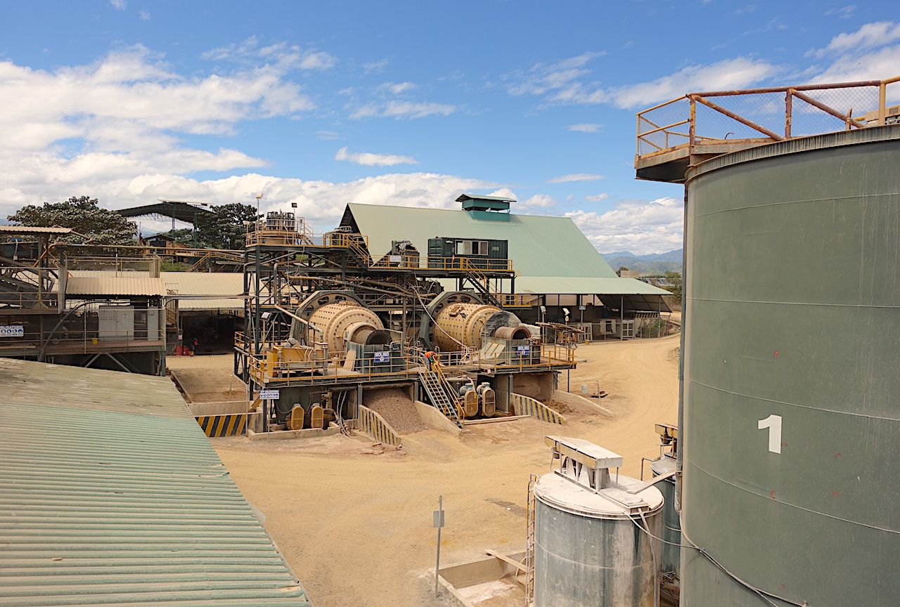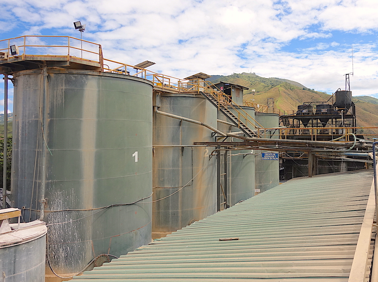 The lay of the land at Portovelo is shown below. In the far background, the high roof of the blending stockpile shed is seen, and at mid-right is seen the process stockpile building. Process tank #1 appears lower-right.