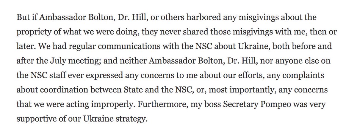 Ambassador Sondland testified that neither Fiona Hill, nor John Bolton nor anyone else on the NSC staff ever raised any misgivings about what was going on. npr.org