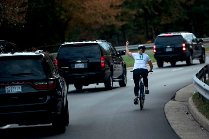 BRENDAN SMIALOWSKI VIA GETTY IMAGESJuli Briskman shows her middle finger as a motorcade with President Donald Trump departs Trump National Golf Course in Sterling, Virginia, in 2017. Two years later, Briskman is on the ballot for local office.