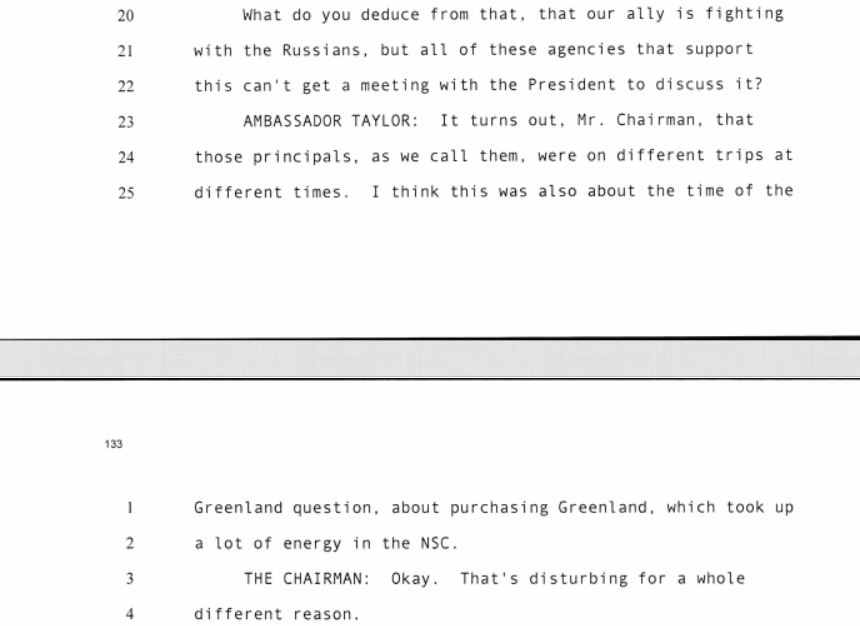 Schiff asked Taylor about his assertion that multiple NatSec officials sought a meeting with Trump to discuss lifting a hold on military aid to #Ukraine but the meeting proved difficult to schedule, because the issue of "purchasing Greenland" took up a lot of energy in the NSC."