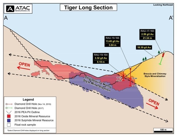 Tiger Deposit PEA Tiger Deposit Long Section (CNW Group/ATAC Resources Ltd.) ATAC believes the carbonate replacement Tiger Gold Deposit offers substantial value via strategic opportunities for near-term development and cash flow at the Rau Project. Work undertaken on the deposit since the previous PEA (announced May 21, 2016), indicates significant upside potential from a new economic study. Mineralization remains open to extension at depth, down dip and along strike.