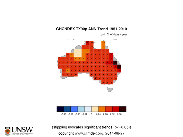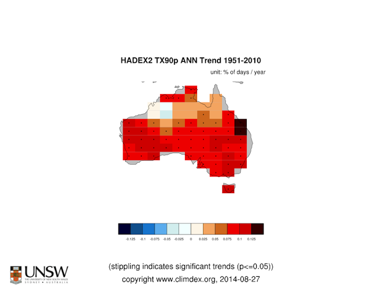 Trends in the frequency of hot days over Australia – adjusted ACORN-SAT data. The period of trend covers 1951-2010 when both datasets have overlapping data. All data used in figures are available from www.climdex.org.