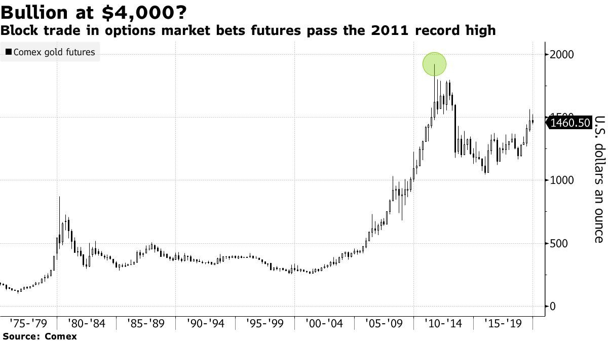 Huge Bets That Gold Could Triple to $4,000 Trade in New York Yvonne Yue LiNovember 28, 2019, 2:32 AM GMT+8 The gold options market saw $1.75 millionin block trades betting the precious metal could almost triple in more than a year, surpassing the record.
