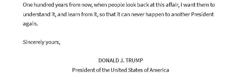 He is right that this letter passes firmly into history, as indelible as the mark of impeachment he now wears. If those future generations rely on his letter to understand what happened, though, they will be sorely misled.