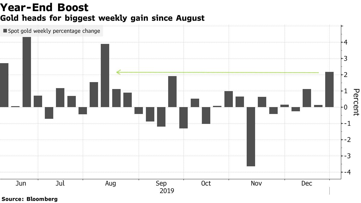 The precious metal is up 18% this year as central banks reduced interest rates, and the to-and-fro between the U.S. and China over trade boosted demand for havens. The Federal Reserve has signaled it would keep interest rates on hold through 2020 following three cuts this year, and a gauge of the dollar has erased its annual gains.