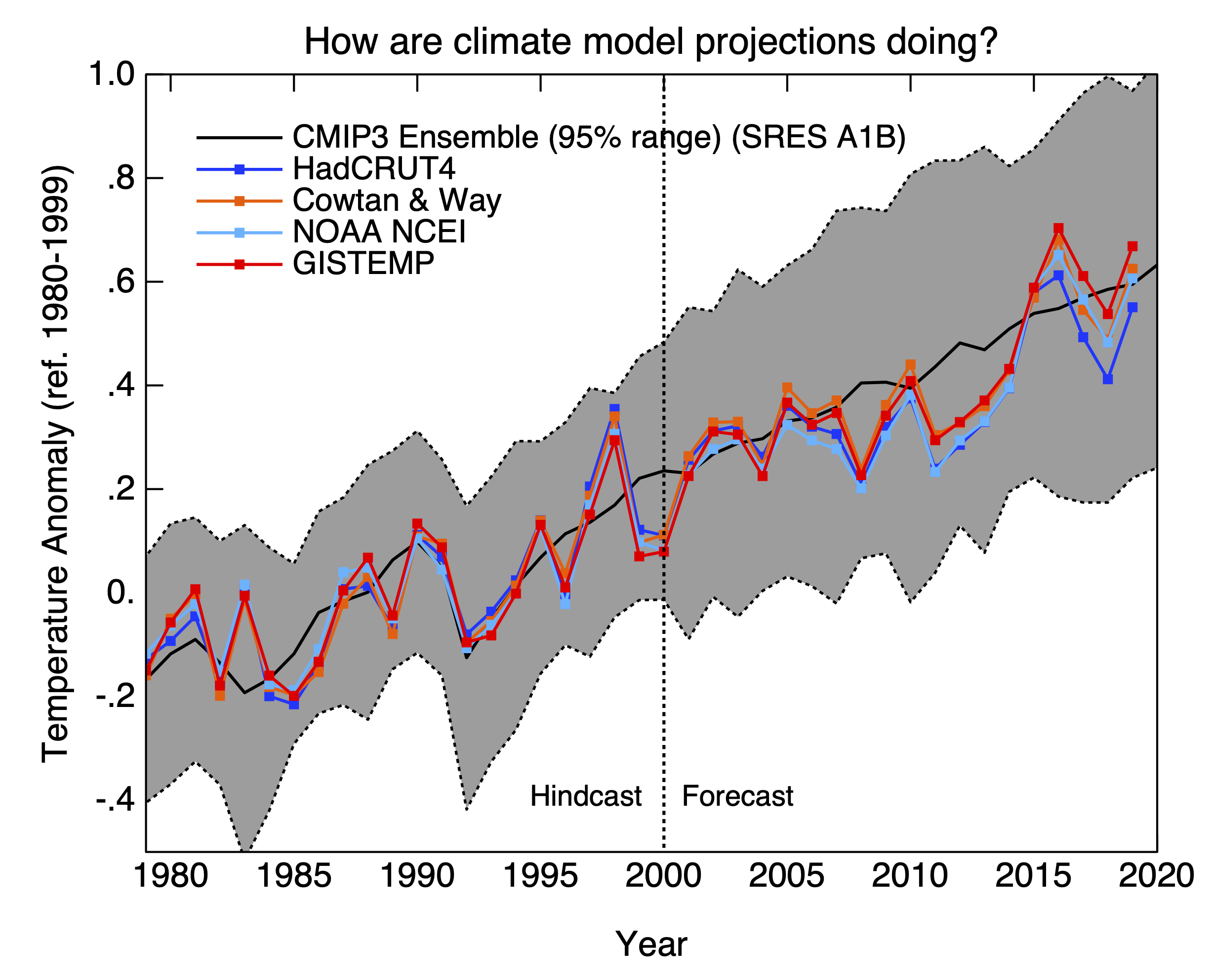 Note that Hausfather et al. (2020) made a more complete assessment of previous model projections from 1970 through to CMIP3 ( discussed here).