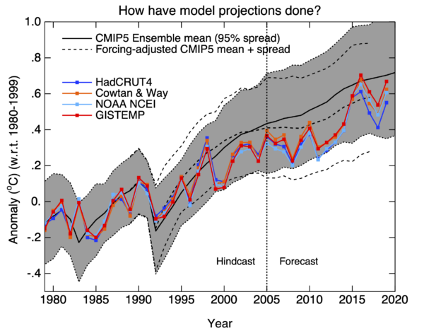 Last discussion (2015). Model spread is the 95% envelope of true global mean surface temperature anomalies from all CMIP5 historical simulations (using the RCP4.5 projection post-2005). Forcing adjustment is updated from Schmidt et al. (2014). Observations are the standard quasi-global estimates of anomalies with no adjustment for spatial coverage or the use of SST instead of SAT over the open ocean. Last updated 26 Jan 2020.