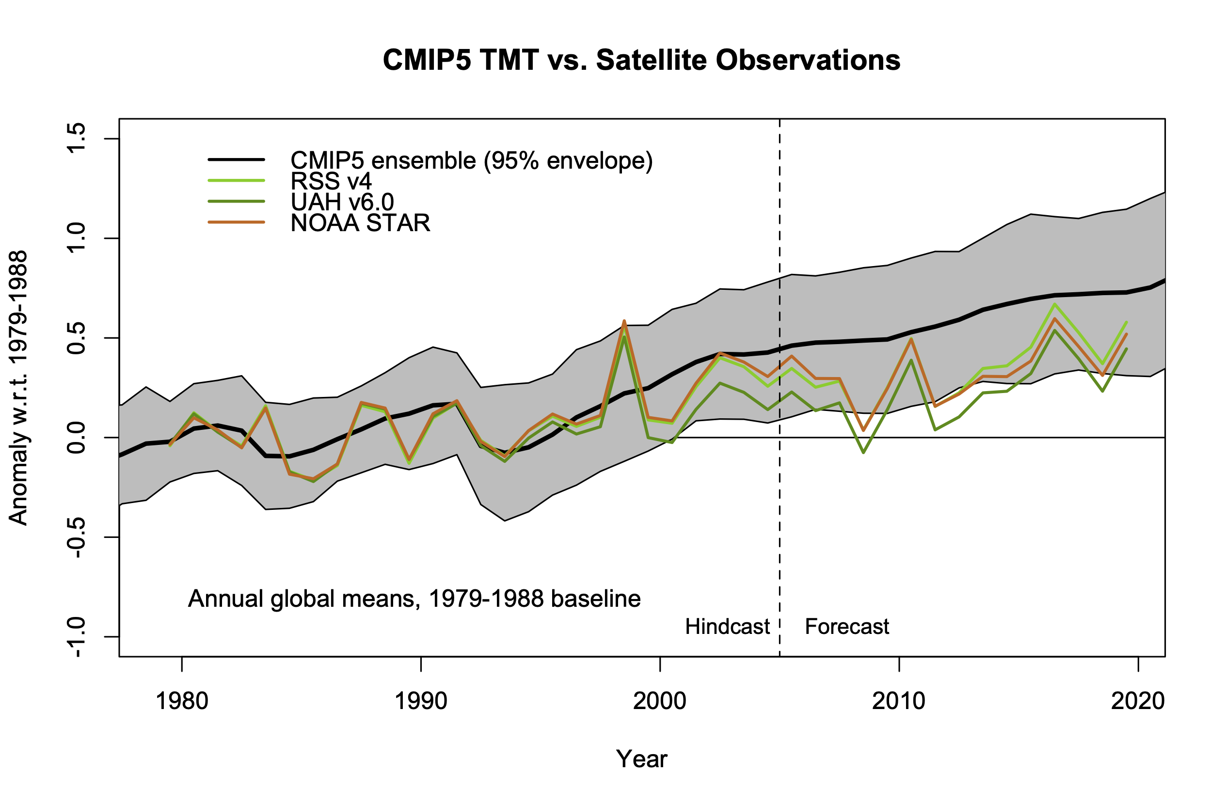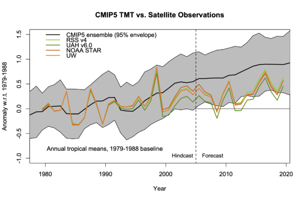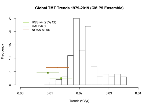 Original discussion (Jan 2017). Mid-troposphere satellite products from UAH, RSS, NOAA STAR and UW. Model values use synthetic MSU-TMT weightings, spread is 95% envelope of simulations. Last updated 26 Jan 2019.