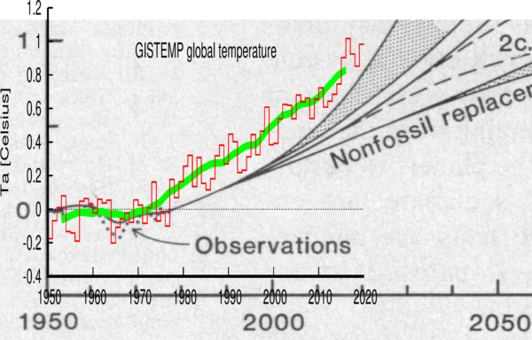 Original discussion (figure courtesy of Geert Jan van Oldenborgh, Hansen et al. (1981)). Observations are the GISTEMP LOTI annual figures and 10 year mean. Last updated: 26 Jan 2020.