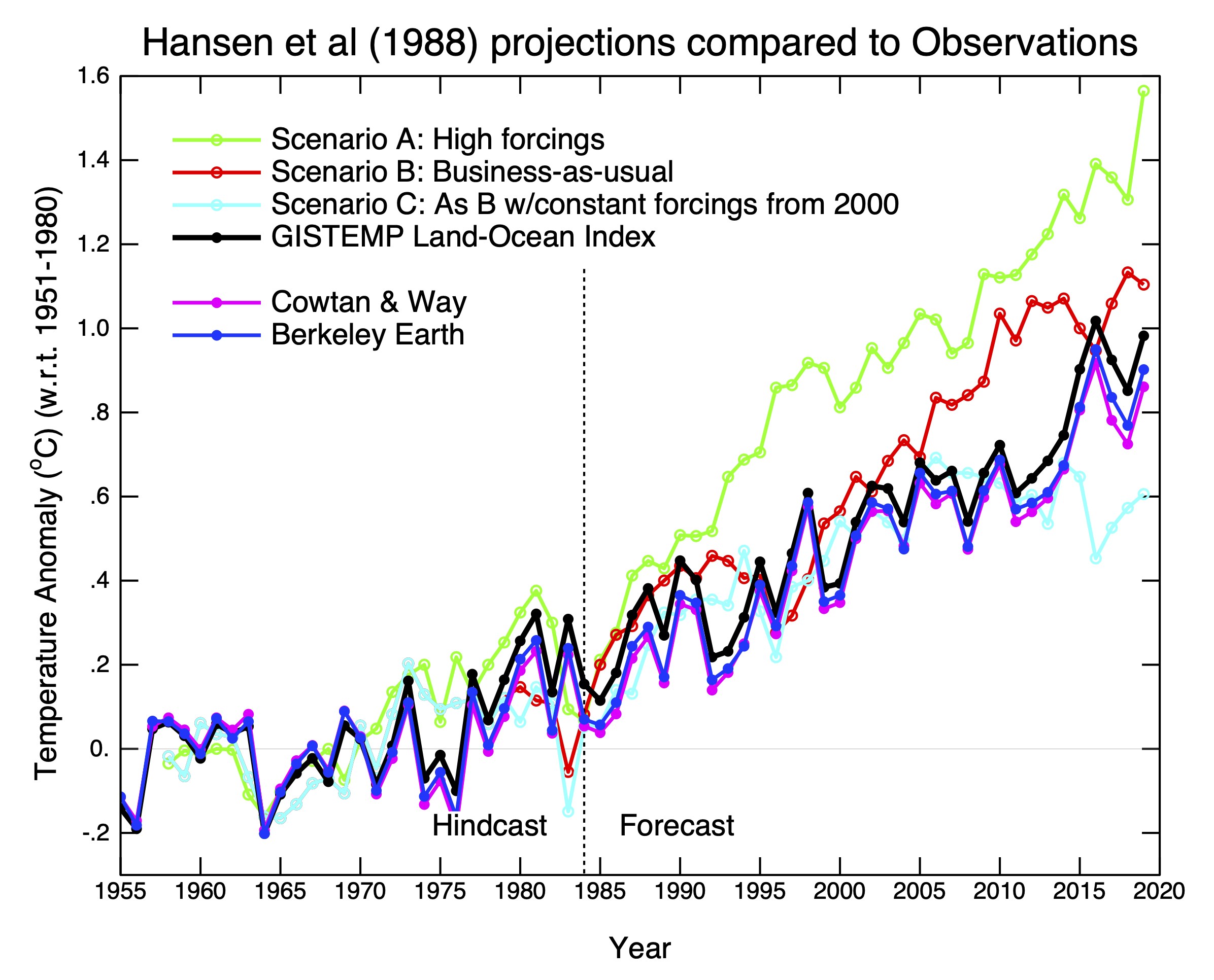 Original discussion (2007), Last discussion (2018). Scenarios from Hansen et al. (1988). Observations are the GISTEMP LOTI annual figures. Trends from 1984: GISTEMP: 0.21ºC/dec, Scenarios A, B, C: 0.33, 0.28, 0.15ºC respectively (all 95% CI ~±0.03). Last updated: 26 Jan 2020.