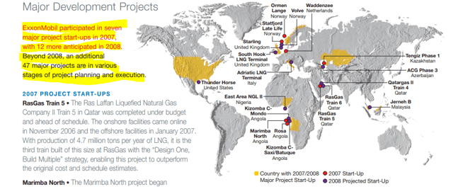 What lies aheadWe keep reading about all the excitement about XOM's projects in Guyana and its decision to jump on the Permian treadmill. In that regard, we think that those projects are a way of offsetting base decline rates. Anyone projecting any big increases in cash flow from them is very sadly mistaken. To understand this, please have a look at the number of projects XOM has brought online every single year. We show below 2007 just as one example.
