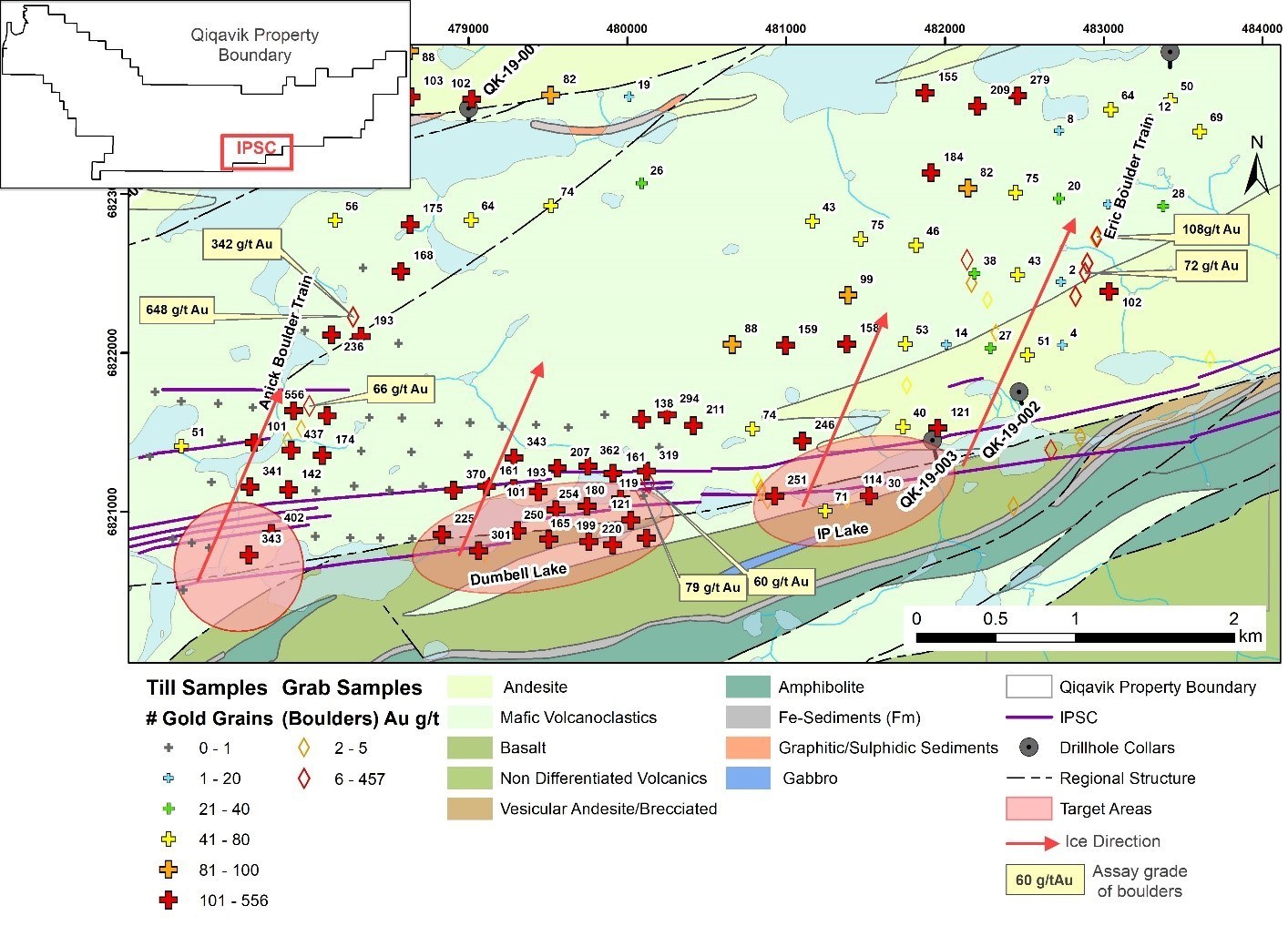 Normalized gold grain count results received to date show clusters of till samples with more than 100 grains around Dumbbell Lake and along the Anick boulder train north of the western portion of the IPSC. These results include the highest counts received to date on the property and are significantly higher than those from the area around IP Lake where QK-19-002 and QK-19-003 were drilled. These samples form the largest and best defined till anomalies to date on the Qiqavik Property. Given the ice transport direction toward the north-northeast, the close association of these anomalies with the IPSC and secondary cross-structures provide compelling vectors for targeting further exploration.