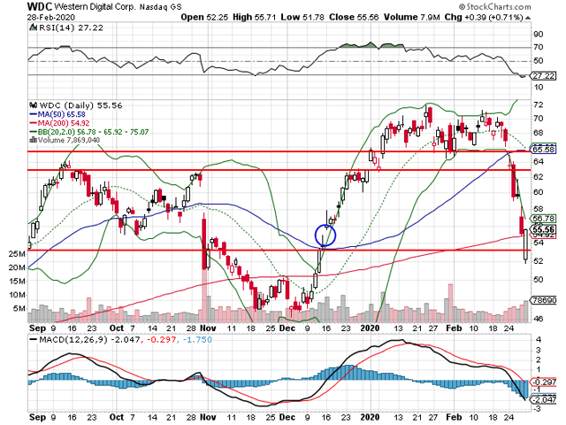 The Friday close showed strength at two support levels and wound up closing above the lowest support level (bottom horizontal red line) and the 200-day moving average. Additionally, the stock is outside the lower Bollinger band and typically likes to move back inside of the bands sooner rather than later. At these levels, I had added and will continue to add to the position in WDC I started when it was in the mid-to-high $40s. The dividend yield of 3.6% also plays a factor in creating a bottom in shares.