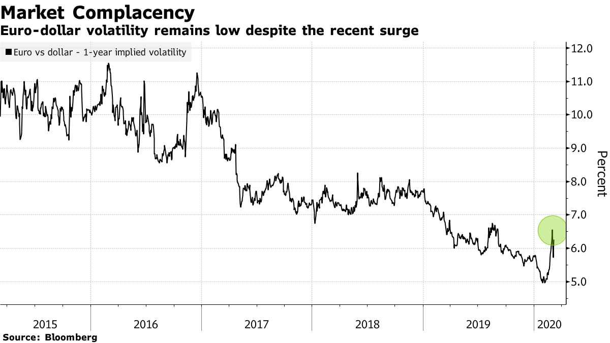 One-year implied volatility in euro-dollar, which climbed at the end of February to the highest since mid-2019, retreated earlier this week. However, the measure surged higher Friday to levels above the average for the past year of around 6%. Riddell said positioning for increased currency swings via options was incredibly cheap in January.