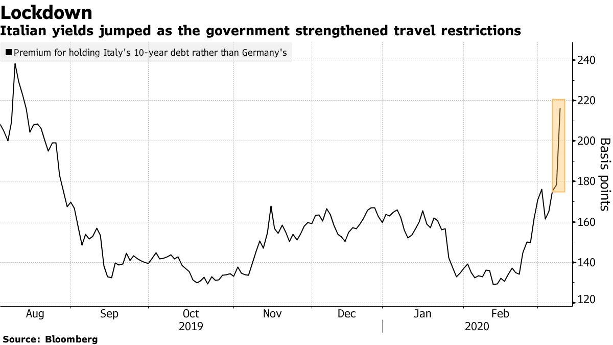 Italian government bond yields jumped on Monday after Prime Minister Giuseppe Conte’s government imposed a sweeping lockdown in the country’s industrial and financial engine room to contain the coronavirus.