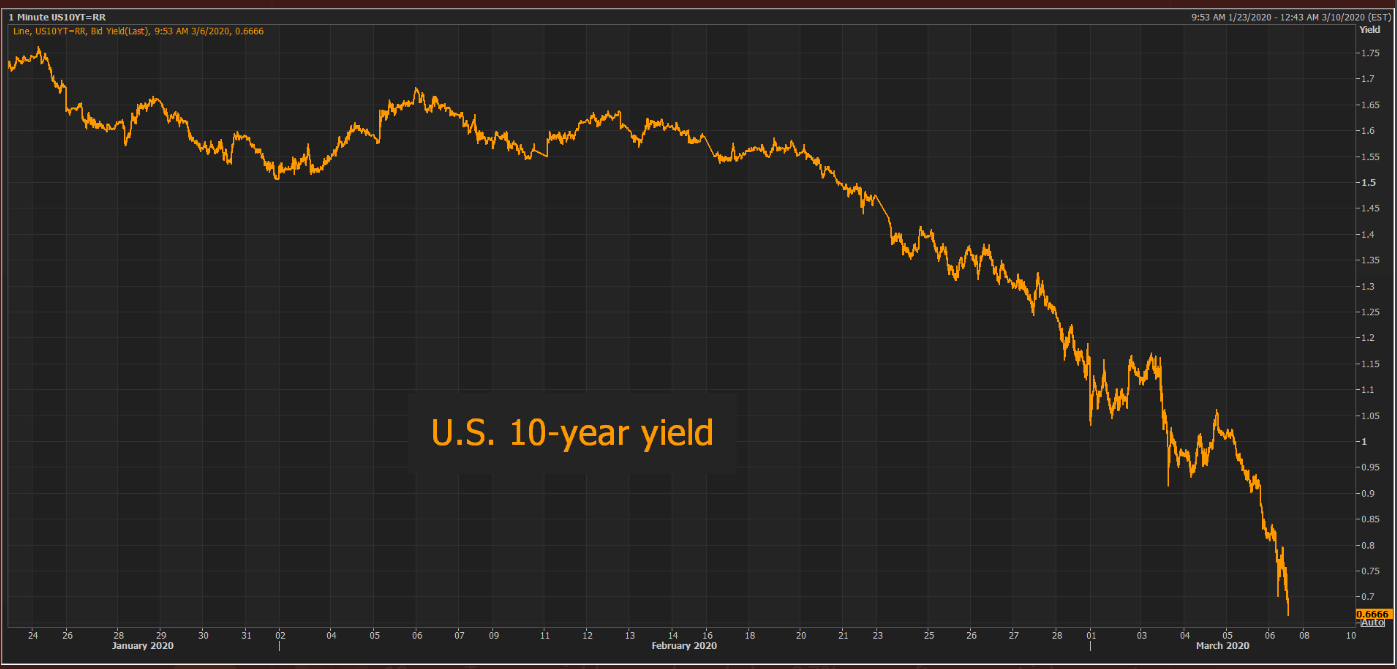 If the epidemic and the Fed's response to it brought 10-year yields below 1% for the first time, dissension among oil producers has brought them below 0.5% less than a week later. Possibly even more remarkable is the fall in the 30-year yield, which dropped below 1% at the Asian opening, easily its lowest ever: