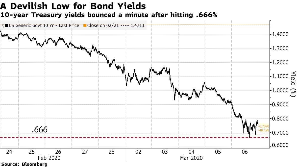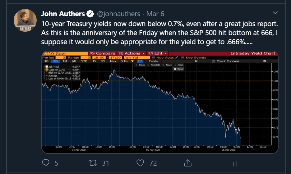 Last Friday was the 11th anniversary of 666 Day, and saw immense buying of Treasury bonds, where yields had just gone below 1% for the first time ever. Early on Friday morning, amid the carnage, I attempted a joke on Twitter to relieve the tension: