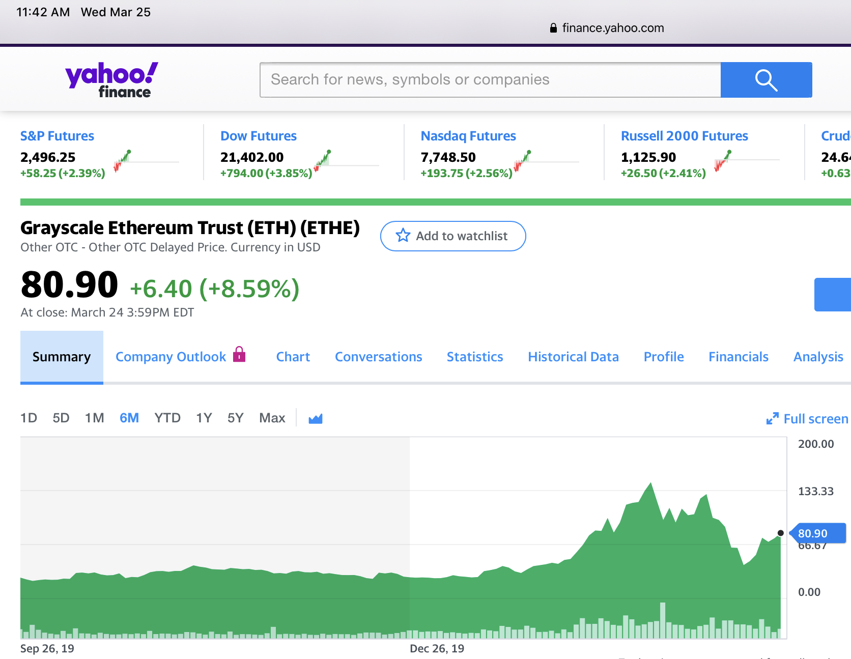 (2020 03 20 buy) ETHE @ 83.12 and GBTC @ 7.64 (certainly avoided major wounding, I hope, on both) Both ETHE and GBTC should recover quickly, long before any debt-fueled or otherwise chocked on employees companies would, because both are useless, and do not do anything, without pesky employees, bothersome governance, cretin management, ...