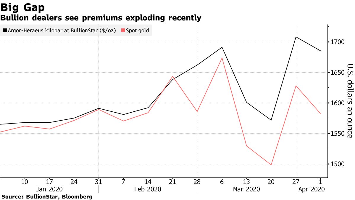 Certain products also command more of a premium than others. Kilobars manufactured by Argor-Heraeus SA, one of the big Swiss refiners whose plant has been closed since last week due to the health crisis, were selling for over 6% above spot, said Ronan Manly, an analyst at Singapore dealer BullionStar.