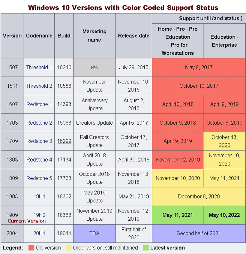 Windows 10 Version History & Support Status by color (Wikipedia) ...