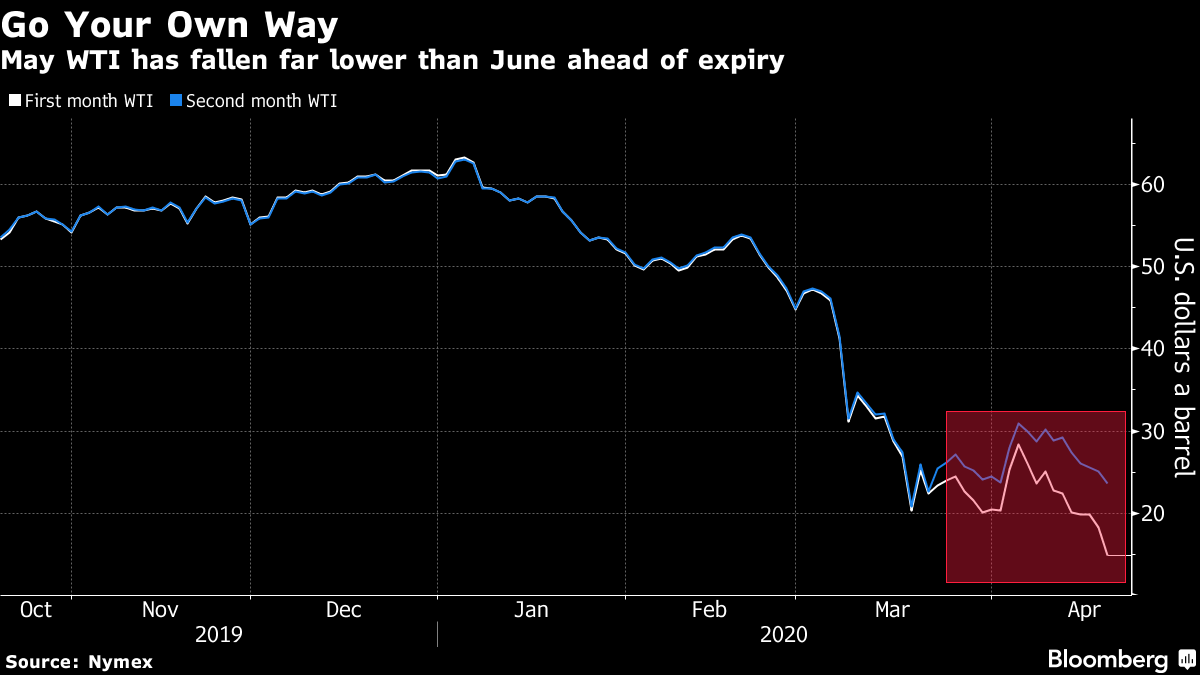 The most immediate West Texas Intermediate contract fell as much as 22% to $14.19 a barrel. While a major part of the slump is because the May futures contract expires on Tuesday, the collapse nonetheless reflects a fast-growing glut of oil, and rapidly expanding stockpiles in Cushing, Oklahoma, the American pricing hub.