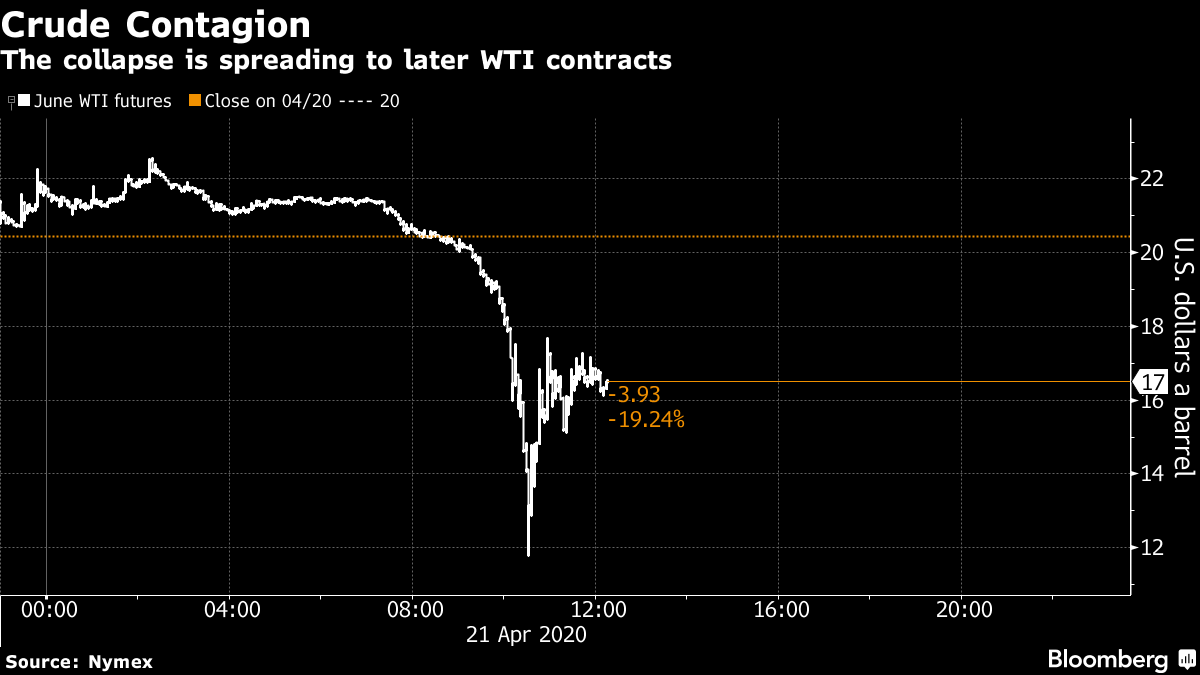 WTI for June delivery dropped as much as 42% to $11.79 a barrel, before recovering slightly to $16.44 as of 7:17 a.m. in New York. The thinly traded May contract remained below zero at -$5.78 a barrel. Brent crude slumped 16% to $21.37, having earlier dropped to as low as $18.10.