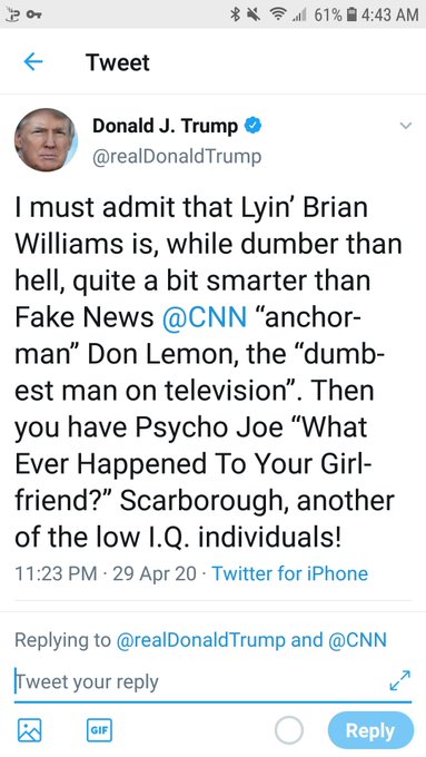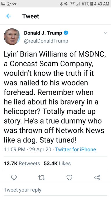 Even if Brian Williams, Don Lemon, Joe Scarborough and every other member of the media is lying. Why is anybody OK with the president rage tweeting at midnight? why is the president not thinking about the 1 million Americans infected or the 60,000 dead from a preventable virus