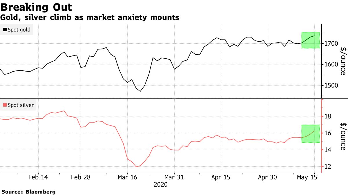 “The market seems to be bracing itself for disastrous hard data for April and May and a wave of bankruptcies,” said Ole Hansen, head of commodity strategy at Saxo Bank A/S. That supports the traditional safe haven gold, and “has added some extra spice to silver,” he said.