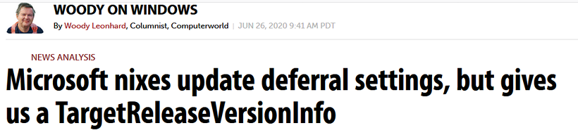 The company intentionally removed the “update deferral” options from the Win10 version 2004 Update Advanced options pane, ostensibly “to prevent confusion.” Riiiiight. But there’s good news: a newly documented Pro, Education and Enterprise Registry setting that circumvents the version deferral problems. And it appears to work in version 1803 onward.