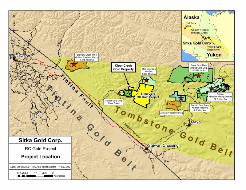 Cor Coe, Director and CEO of Sitka, commented: "The Clear Creek Gold Property is an exceptional addition to our district scale RC Gold Project located in Yukon's prominent Tombstone Gold Belt. Past work on Clear Creek has defined several mineralized zones with both bulk tonnage, intrusion-related gold deposit targets and high-grade, vein and breccia hosted gold targets. We look forward to conducting work on the Clear Creek Gold Property this summer as part of our 2020 exploration program at the RC Gold Project."