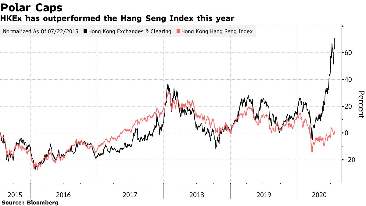The flipside is Hong Kong Exchanges & Clearing Ltd., the firm that actually operates the stock exchange. Worth about $60 billion, it’s the second-biggest of the world’s 24 listed bourses, closing in on Chicago’s CME Group Inc. It’s the priciest exchange, trading at 40 times price-to-earnings, and boasts a 60% premium to peers. The stock, which closed at a record earlier this week, is up more than 45% in 2020, extending gains Thursday morning.