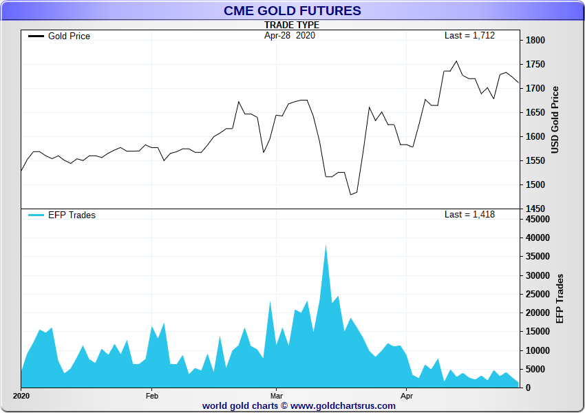 AddendumIt can be, as John Reade wrote me, “banks and traders probably still have large EFP positions that they haven’t been able to cover.” I noticed on Nick Laird’s website Goldchartrus.com that EFP volume cleared through CME’s ClearPort is decreasing since early March, to levels not seen in a long time.