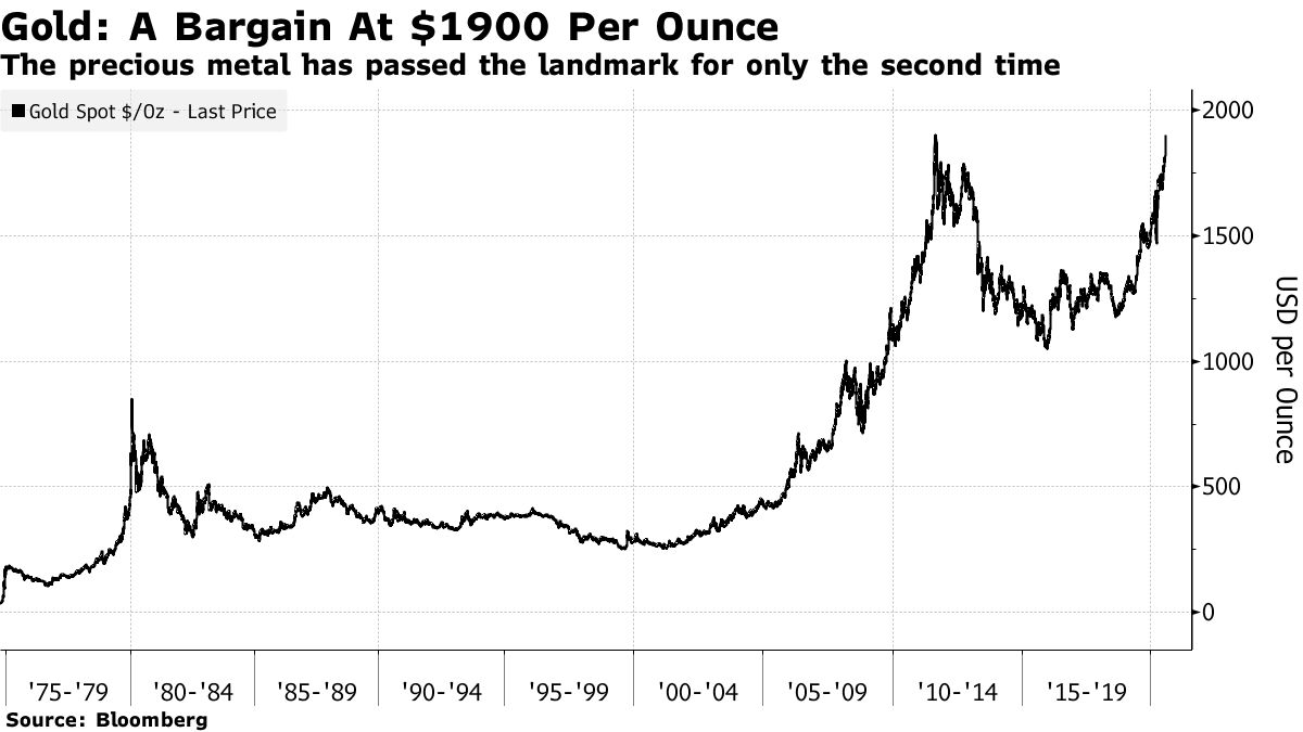 There is plenty of talk about a bubble in some new companies with untried business models. Think, particularly, of Tesla Inc. But is there something equally unsustainable going on in a commodity whose virtues have been known for millennia, and remain unchanged? Spot gold rose to a record of $1,923.2 an ounce in Asian trading Monday: