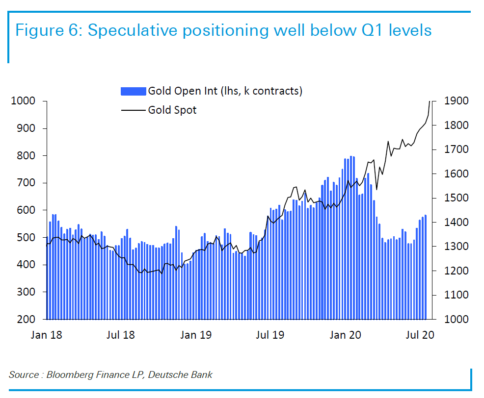 So, is gold falling victim to speculative excess? One counter-argument comes from Michael Hsueh of Deutsche Bank AG. He points out that the price increase hasn’t been particularly swift or disorderly, with the greatest interest coming from central banks, and particularly, from exchange-traded funds. The GLD ETF now has a market cap of $75 billion, having grown at more than twice the rate of the gold price over the last five years. Meanwhile, speculative positioning in futures suggests the market is less overblown than it was earlier this year:
