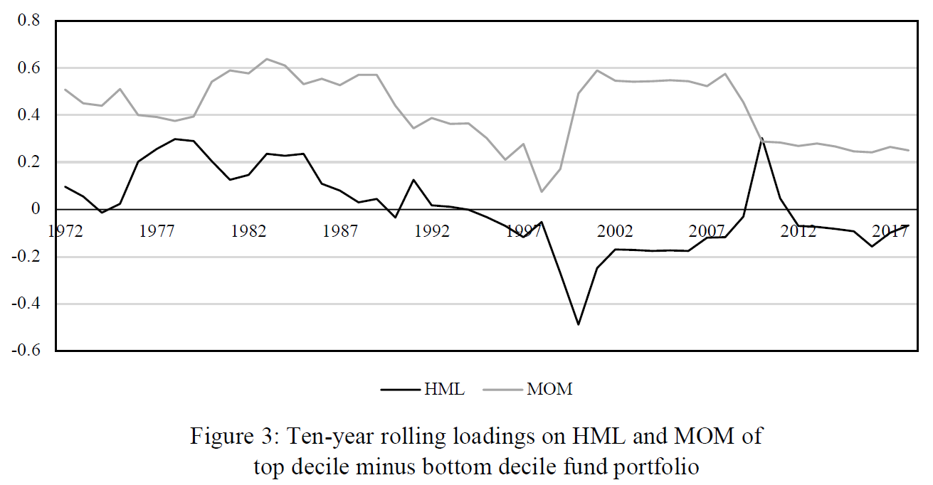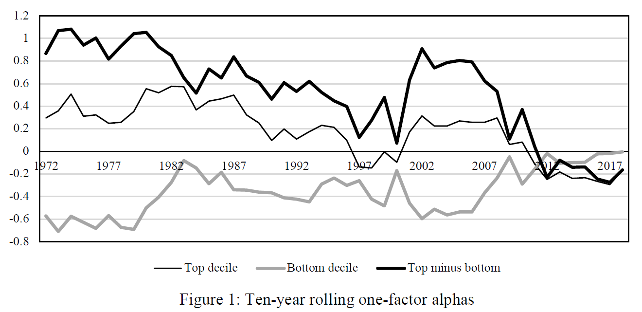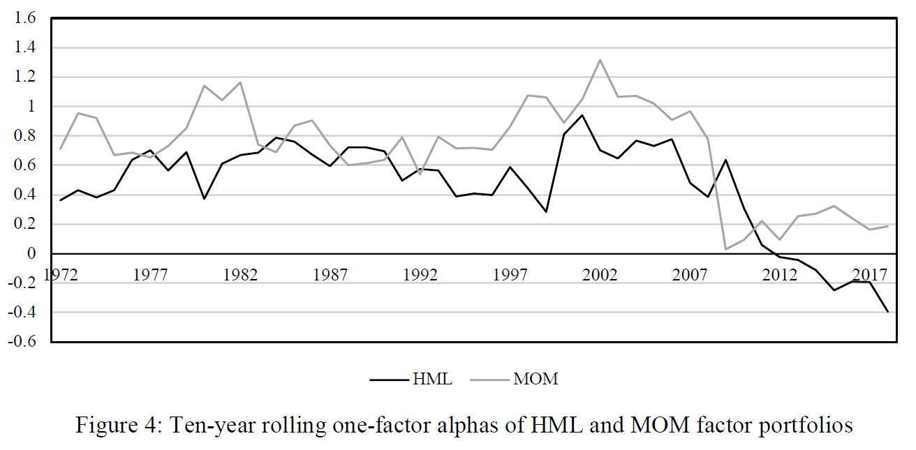 Why might this be? Investment factors have waned over time. The following chart shows that value stocks, picked because they look cheap compared to their fundamentals and labeled HML, after years of showing good performance compared to the market, have been persistently negative in the post-crisis decade. Meanwhile momentum, the phenomenon in which winning stocks tend to continue winning, is outperforming to a far smaller extent than it did in the years when Carhart was conducting his original study:
