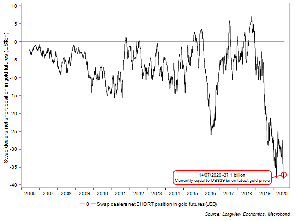 This creates a specific problem for swap dealers, which are run by the bullion banks that make a market in gold. At present, as the following chart shows, they are very “short” gold, meaning they need the price to decline. If gold doesn't fall, and investors ask for physical delivery, the risk is that they will have to buy bullion they don’t yet have. Longview calculates that the bullion banks have a short position worth $39 billion at current prices, the highest since records began in 2006: