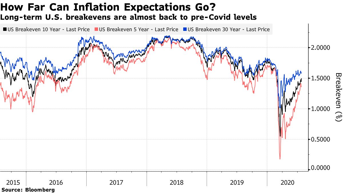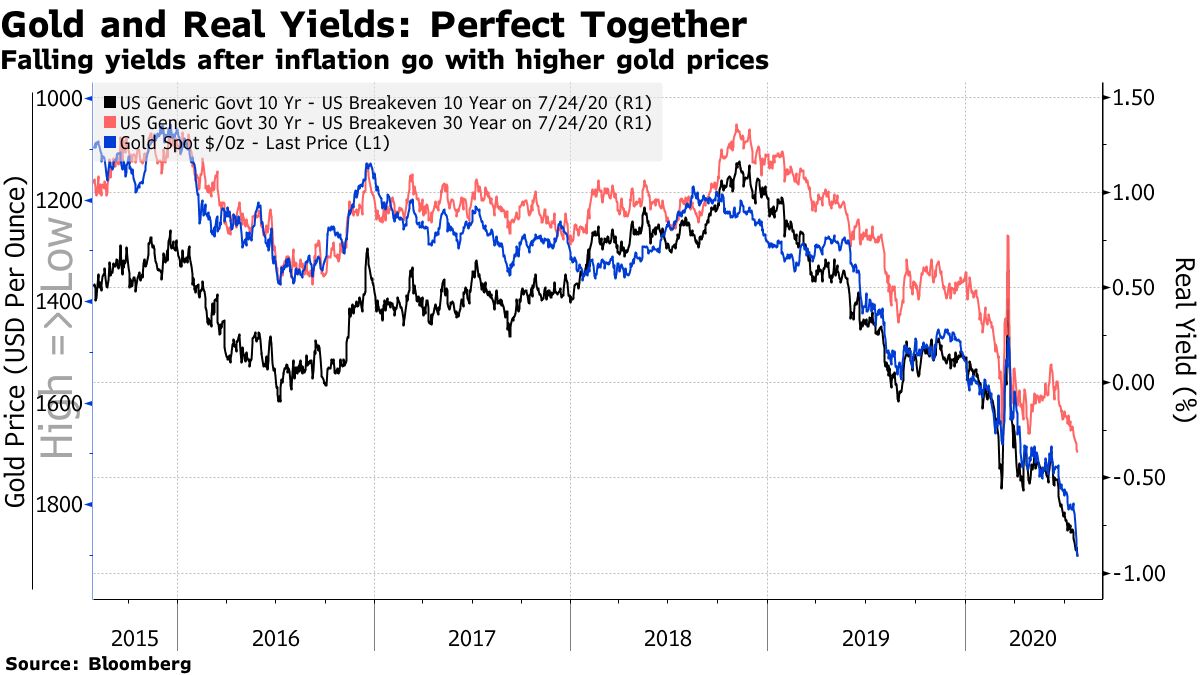 The relationship with real yields is undeniable. But having touched their all-time low from 2012 last week, can they possibly go much lower? Long-term Treasury yields have been flat at around 0.6% for four months, behaving as though the Federal Reserve is holding them there. The decline in real yields has come from a return to more normal levels of inflation expectations: