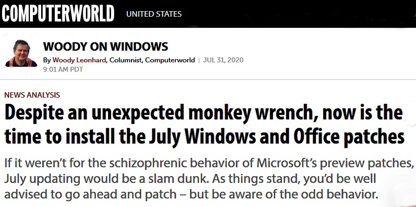 A little warning: If you’re running Win10 1903 or 1909, had Updates paused and clicked on Resume updates, you’ll also install a Potentially Unwanted Program known as KB 4562900, the July 21, 2020 Cumulative Update Previews for .NET Framework 3.5 and 4.8. You can see it, after Windows Update is done rebooting, by going into the Update History pane (Start > Settings > Update & Security > View update history).