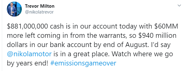 Finally, a tweet from Nikola Executive Chairman Trevor Milton gives a partial update on the company's balance sheet.