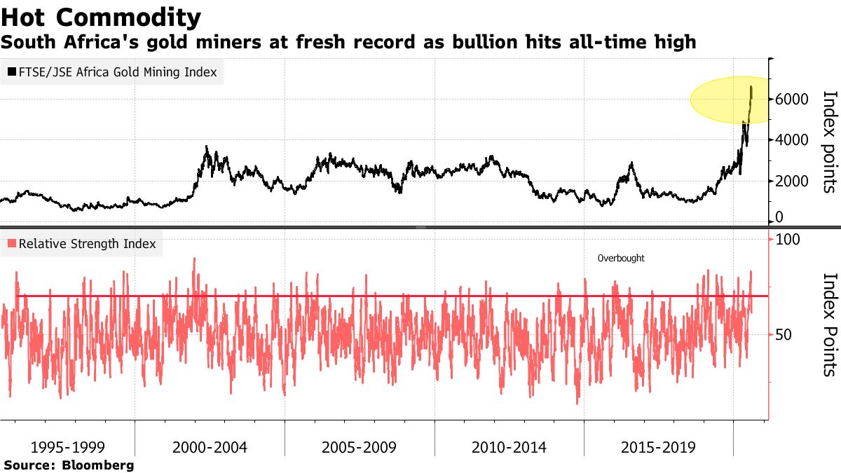 With gold’s meteoric rally driving up the FTSE/JSE Africa Gold Mining Index 119% and into the overbought territory this year, there may not be much room for further gains unless the precious metal trades higher, according to Pretorius, although he’s optimistic over the metal’s prospects longer term.