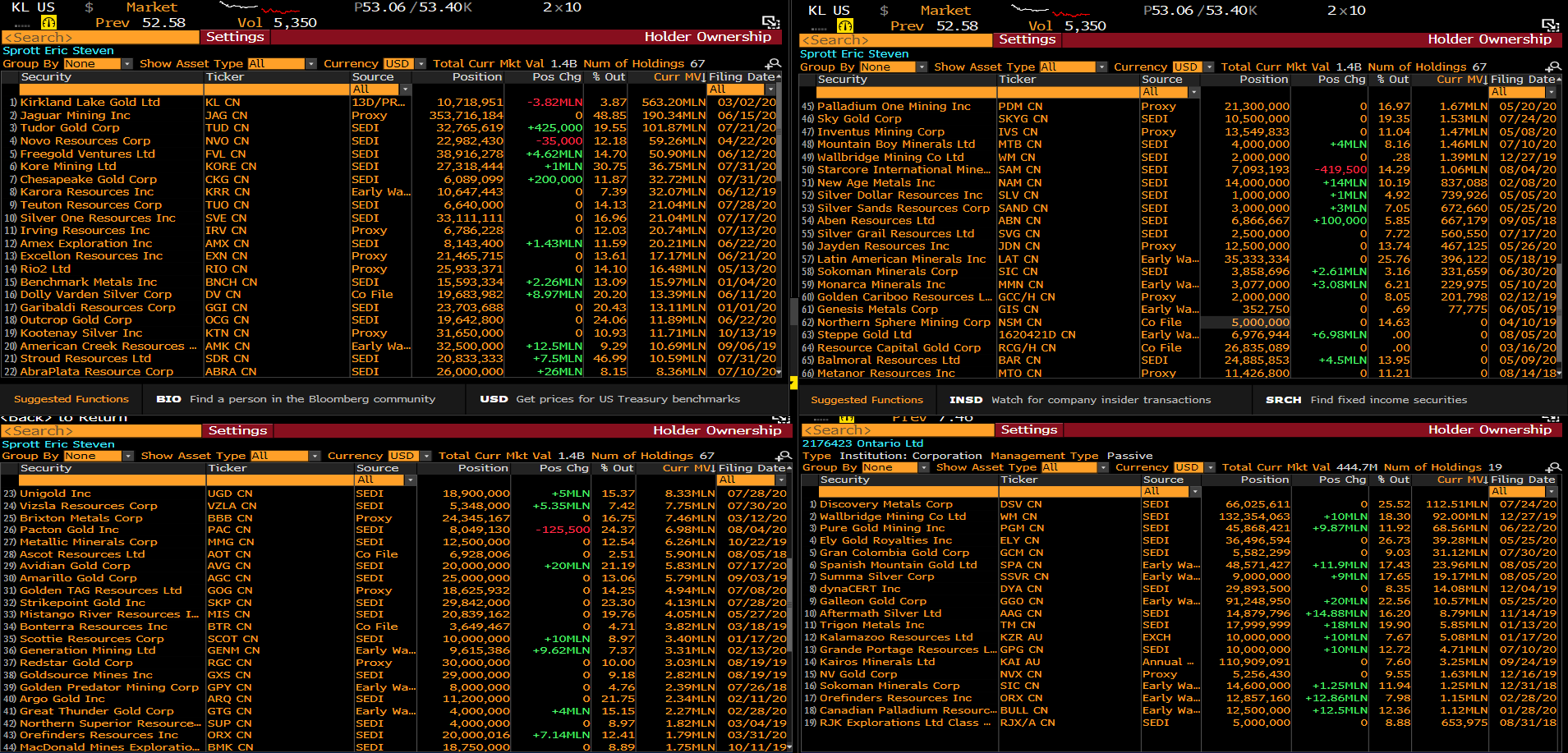 Update on Sprott's holdings since he has been so active lately. He has 67 holdings in his name and 19 in the numbered Ontario company.
