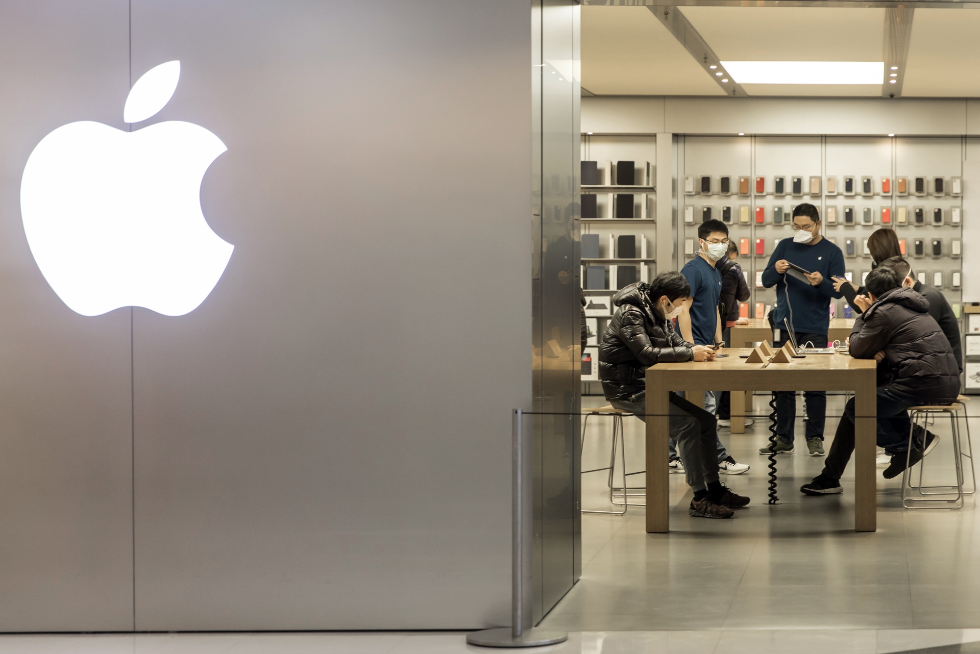 Customers wearing protective masks look at products on display at an Apple Inc. store in Shanghai on March 2.