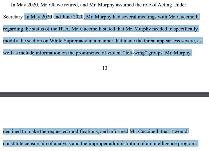 Holy crap. This is from the new DHS whistleblower complaint. He says he was ordered to "modify" a threat assessment, particularly "the section on White Supremacy" to make "the threat appear less severe," and "include information on the prominence of violent 'left-wing' groups."