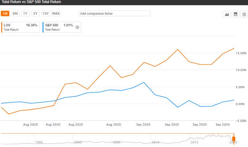 Southwest forecasts operating revenue will fall 65-70% in September, capacity -40% and a load factor of 40-45% is anticipated for the month.