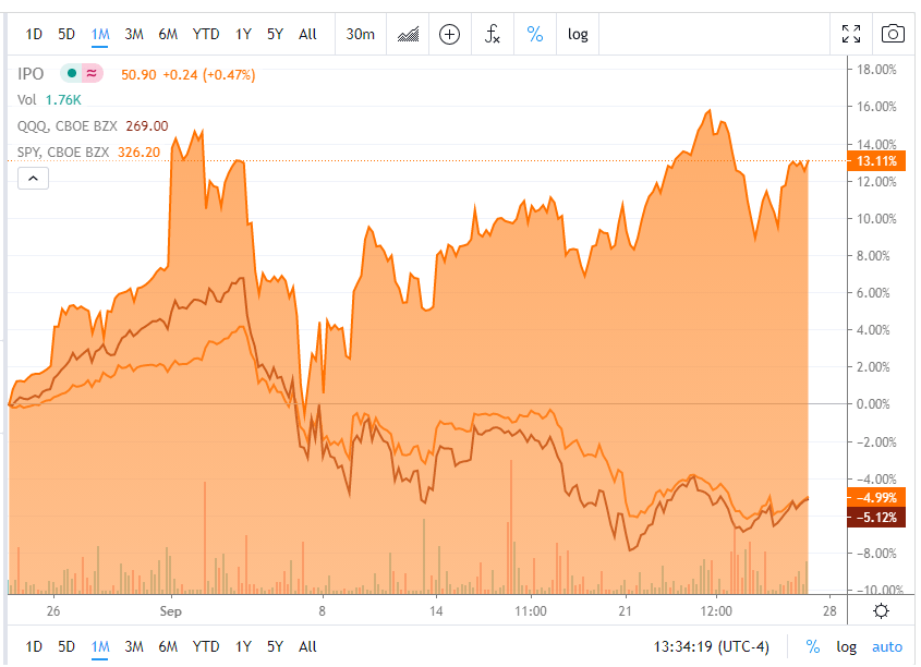 These technology names are the biggest gainers in the Renaissance IPO ETF (NYSEARCA: IPO). IPO itself has surged 13% over the last month, while the QQQ is off 5.2% and the SPY has dropped 5%.