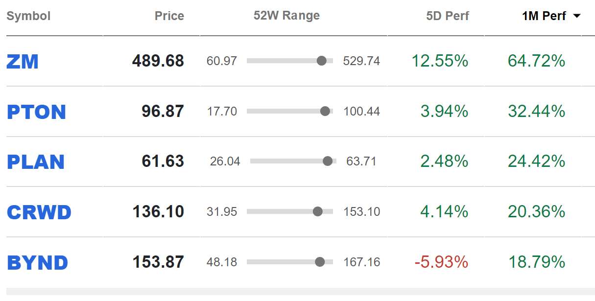 The top five performers in the ETF over the last month are Zoom Communications (NASDAQ: ZM), Peloton (NASDAQ: PTON), Anaplan (NYSE: PLAN), Crowdstrike (NASDAQ: CRWD), and Beyond Meat (NASDAQ: BYND).