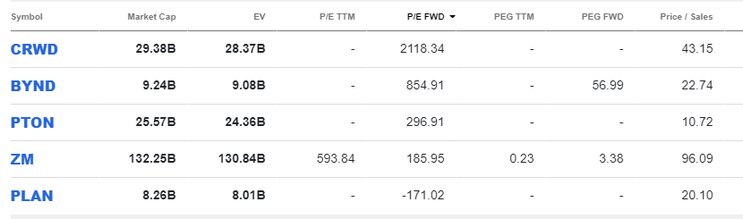 Amazon (NASDAQ: AMZN), for example, is the most expensive of the FAANGs with a forward multiple of 95. Zoom Communications ( ZM), the cheapest of the new cohort, commands a multiple of 186.