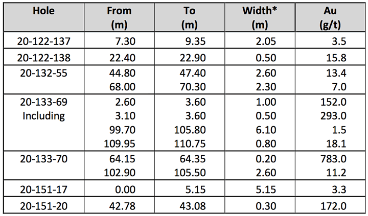 Assay results have been received for the first 21 holes, representing just 3% of the planned metres of drilling. Seven holes intersected anomalous gold mineralization, which is considered good given the characteristic nuggety-style gold distribution. The best intersections are shown in the table below. Several of the holes have multiple intersections due to the stacked nature of the mineralization. The intersection widths reported are core lengths and high-grade intersections have not been capped, as the vein interpretation and statistics have not been finalized for the zones. The locations of the new mineralized intersections are shown in figures 1, 2 and 3.