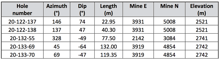 Best results for the Beaufor Mine property, 2020 drilling program (first set of assays):