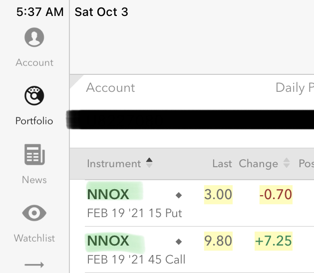 Exited NNOX short share position after markets closed. The shares ramped 50% because the company is apparently willing to demo its dubious technology, prove critics wrong or just re-up on alleged fraud. Left behind the long NNOX calls and long NNOX puts to do rear-guard duties. The long calls should do well until tech demo day in late November. May even add to longs, for just because it might be a fraud doesn’t mean it won’t ramp more.